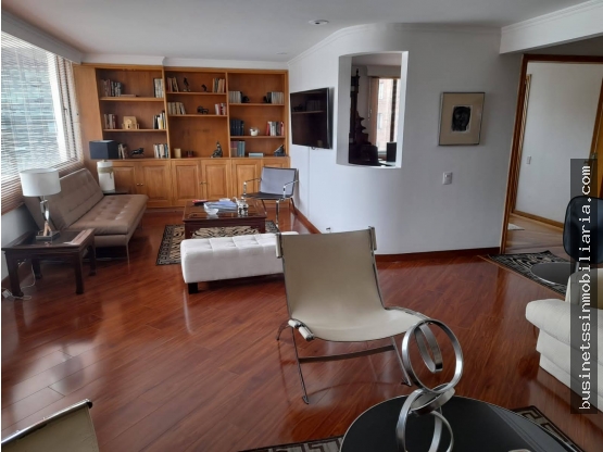 Arriendo apto amoblado Chicó con 100m2 1 alcoba 2 baños Cocina cerrada tradicional Cuarto de servicio con baño Chimenea Sala y estudio (un solo ambiente) Comedor independiente 1 Parqueadero 1 deposito Piso 6 interior esquinero con muy buena luz. CANON inlcuida administración